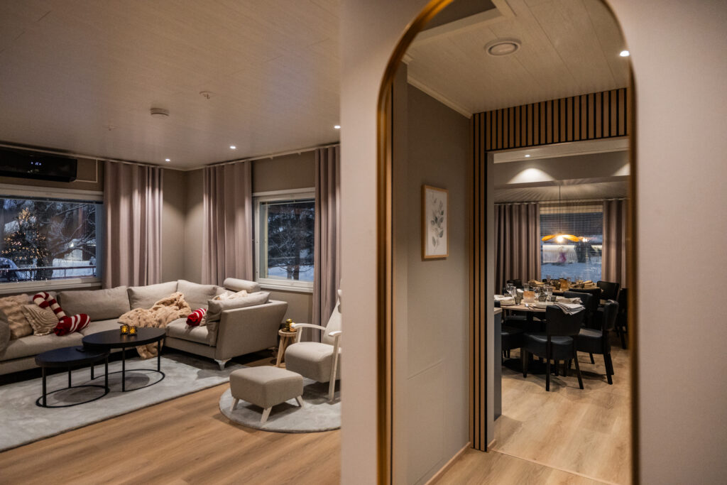 Tämä tilava, korkealuokkainen ja upeilla jokimaisemilla varustettu asunto sijaitsee Rovaniemen sydämessä, vain kivenheiton päässä Joulupukin pajakylästä. Äskettäin remontoitu kolmikerroksinen talo yhdistää keskeisen sijainnin rauhalliseen joenrantaympäristöön. Tilavat huoneet, hyvin varusteltu keittiö ja laadukkaat sängyt takaavat mukavan oleskelun suuremmillekin porukoille. Oma spa-huone saunalla ja baarilla luo täydellisen tunnelman rentoutumiseen arktisten seikkailujen jälkeen. Nauti oleilustasi tässä tyylikkäässä kodissa Lapin sydämessä.