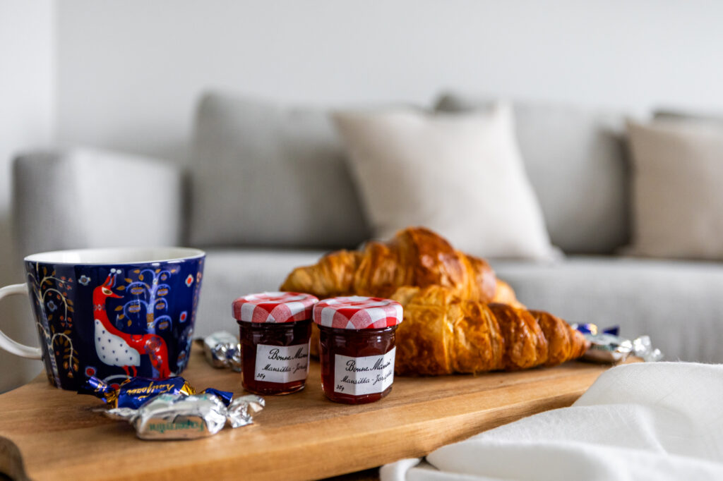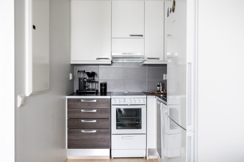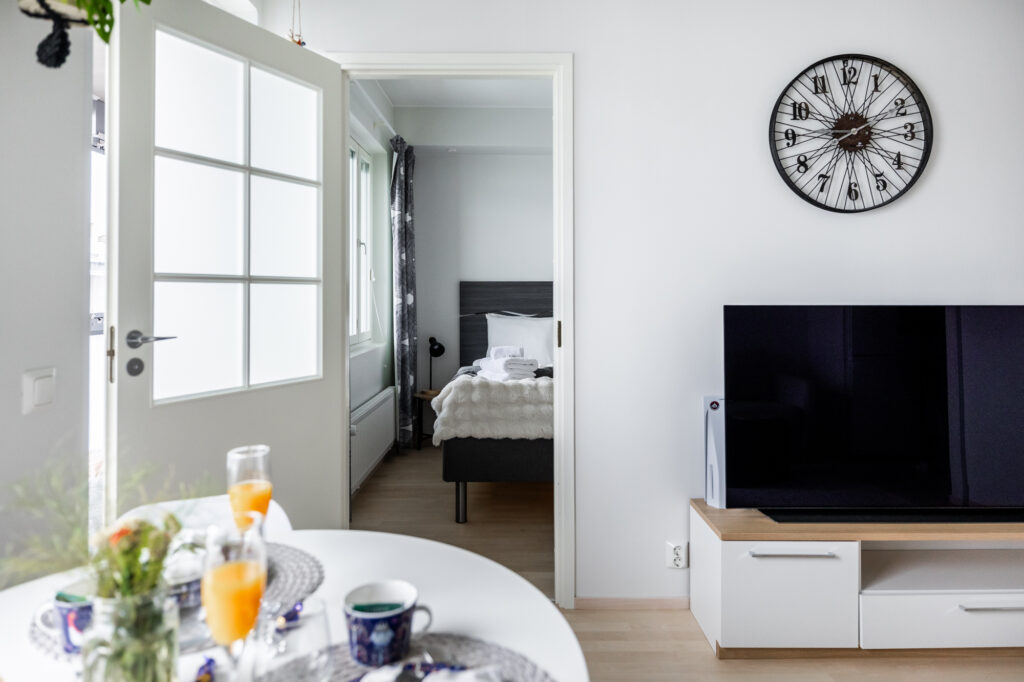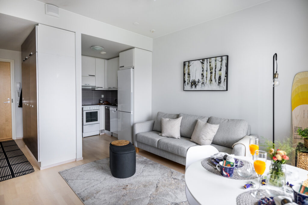 - Olohuoneessa älytelevisio, keittiössä kattavat ruoanlaitto- ja ruokailuvälineet, mikroaaltouuni, jääkaappi, liesi, uuni, astianpesukone ja leivänpaahdin