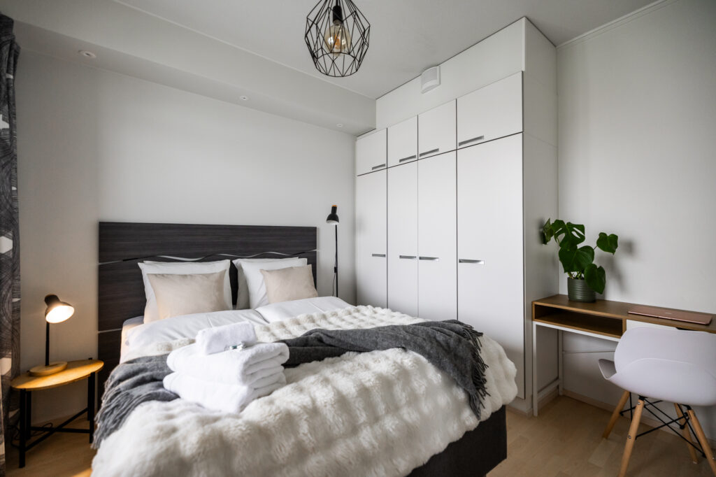 - Makuuhuoneessa 160 cm leveä laadukas parisänky ja olohuoneessa 140 cm levitettävä sohvavuode
